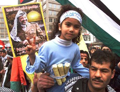 At a demonstration in Berlin, Germany on April 13, a Palestinian demonstrator carries his daughter, who is wearing a mock belt of explosives symbolizing the belts worn by suicide bombers. German prosecutors opened an investigation that could lead to criminal charges against the man for condoning acts of violence. Germany's Interior Minister said this was an "outrageous" abuse of a child as an "advertisement for terrorist acts."