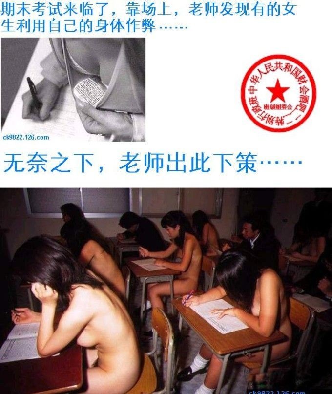 Interestingly, while innocently surfing for "the benefits of nude schools" I found the following photo of a supposed class in China that has found a real solution to the problem of students cheating (click on image for large NSFW view):