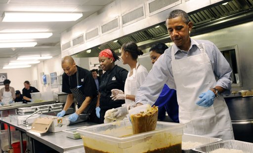 U.S. President Barack Obama (R) with daughter Malia Obama, and, from left, Jeffrey Ragsdale, Jamillah Linkins, and Marianne Ali, participate in a service project to commemorate the 9/11 anniversary at DC Central Kitchen September 10, 2011 in Washington, DC. The First Family packaged meals that will go to organizations such as DC Public Schools, Covenant House Washington, and New Endeavors by Women.