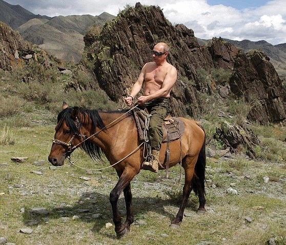 Russian Prime Minister Vladimir Putin rides a horse during his vacation outside the town of Kyzyl in Southern Siberia while tremulous Obama holds on for dear life.